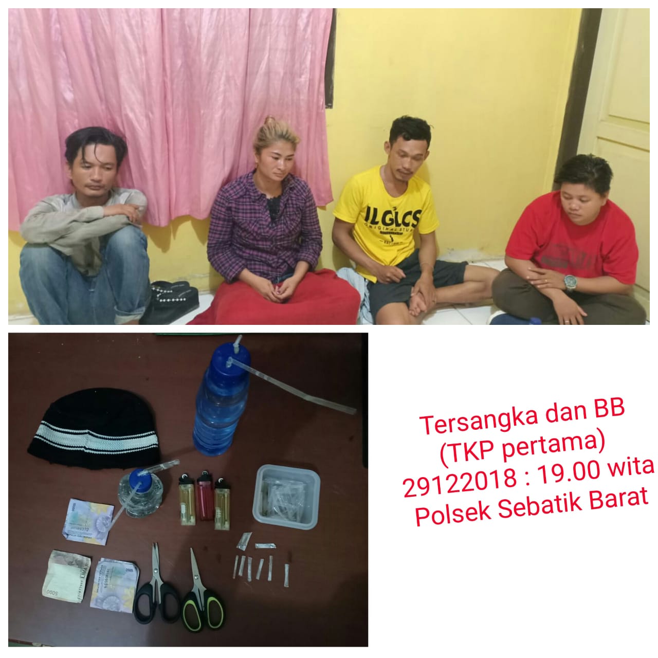 Nunukan – Polsek Sebatik Barat berhasil mengamankan 4 orang tersangka dalam 2 Tempat kejadian perkara dijalan Mantikas Tidung Rt.02 Desa Setabu Kecamatan Sebatik Kabupaten Nunukan Sabtu 29/12/2018, personil Polsek Sebatik Barat menerima informasi dari masyarakat bahwa di sebuah rumah ada seorang yang diduga menyimpan, menguasai dan memiliki Psikotropika jenis Sabu.
