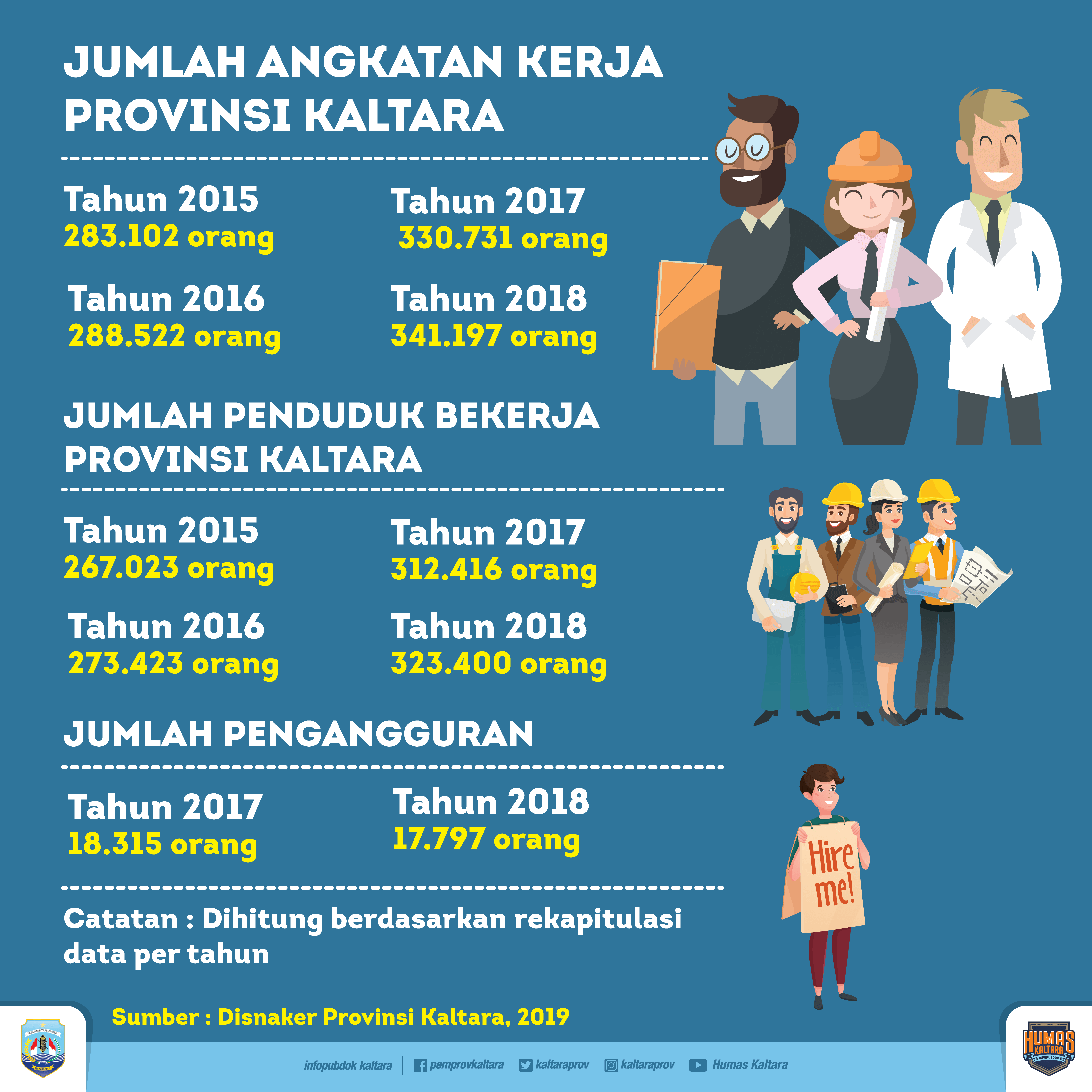 Di tempat terpisah, Kepala Disnaker Provinsi Kaltara Armin Mustafa mengatakan, jumlah pengangguran terus mengalami penurunan. Seperti pada 2017, jumlah penganggur tercatat sebanyak 18.315 orang dan menurun pada 2018 menjadi 17.797 orang. Dalam kurun waktu tersebut terjadi penurunan jumlah pengangguran sebesar 518 orang atau terjadi penurunan tingkat pengangguran terbuka sebesar 0.32 persen dari 2017 (5.54 persen) dan menurun pada 2018 (5.22 persen).