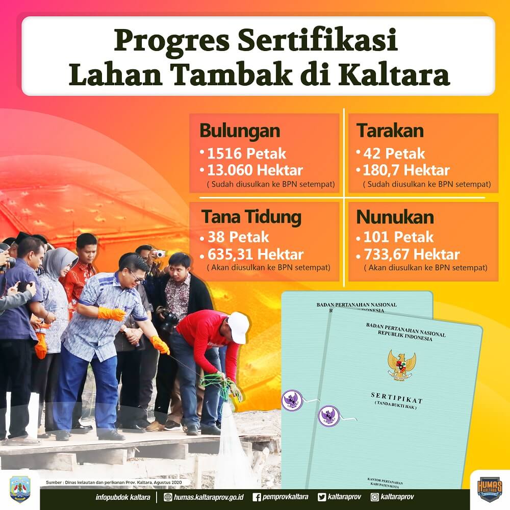 Sebelumnya, melalui DKP, Pemprov Kaltara juga sudah mengusulkan sekitar 13.060 hektare lahan tambak dari 1.516 petak yang berada di wilayah Bulungan dan Kota Tarakan. Namun dalam realisasinya, baru yang berada di Kabupaten Bulungan yang sudah sampai pada tahap pendataan K1 (potensi terbit sertifikat). “Kita terkendala pada masalah beberapa dokumen yang harus diserahkan secara kolektif kepada BPN. Sehingga sertifikat belum bisa terbit,” kata Gubernur, didampingi Kepala DKP Kaltara H Syahrullah Mursalim, baru-baru ini.