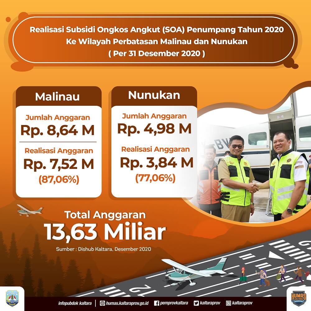 Perlu diketahui pada 2020, anggaran untuk program SOA Penumpang ke wilayah perbatasan dan pedalaman di Kalimantan Utara (Kaltara) khususnya Malinau dan Nunukan, nilainya mencapai Rp 13,62 miliar. Rinciannya, Malinau Rp 8,64 miliar dan Nunukan Rp 4,98 miliar bersumber dari Anggaran Pendapatan dan Belanja Daerah (APBD) Provinsi Kaltara 2020.