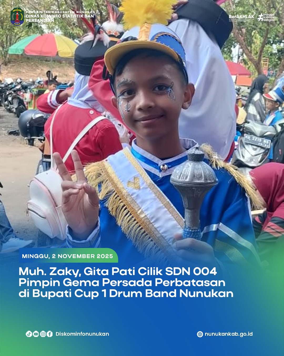 NUNUKAN – Semangat muda terpancar dari wajah Muh. Zaky, siswa kelas 6B SD 004 Nunukan, saat tampil sebagai Gita Pati dalam penampilan Drum Band Gema Persada Perbatasan pada lomba Bupati Cup I Drum Band yang digelar dalam rangka HUT ke-26 Kabupaten Nunukan.
