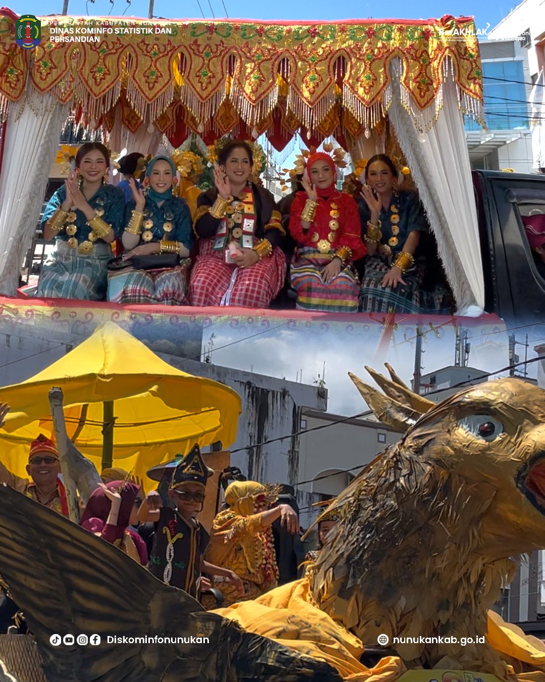 Tampilan yang tidak kalah menarik datang dari Badan Kesbangpol Nunukan, yang menghadirkan mobil hias berbentuk kereta kencana dengan ornamen Garuda. Desain megah dan tampilan simbolik kendaraan tersebut menjadi perhatian masyarakat yang hadir.