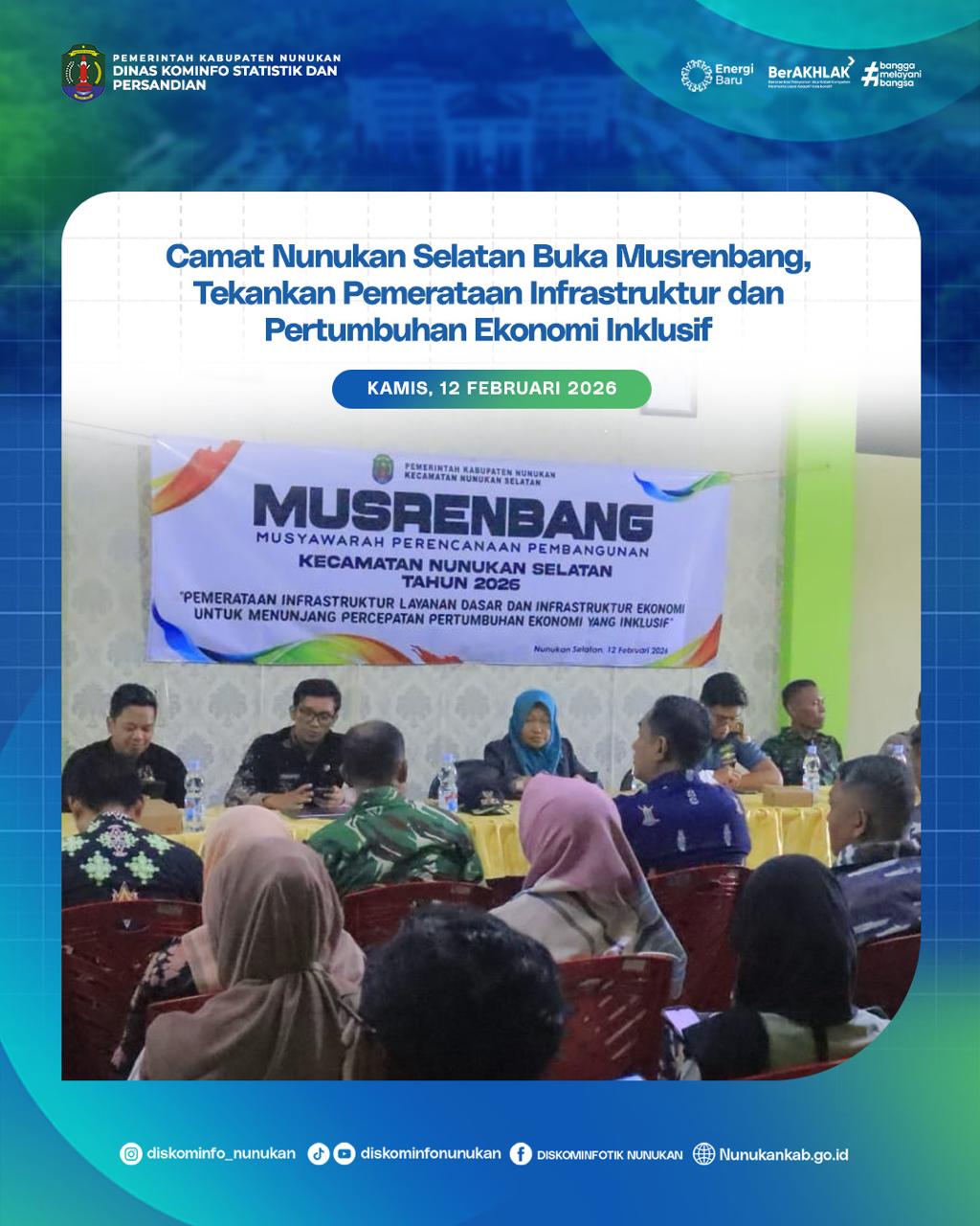 NUNUKAN – Camat Nunukan Selatan, Hj. Ramsidah, SKM.,MM secara resmi membuka Musyawarah Perencanaan Pembangunan (Musrenbang) Kecamatan yang digelar di Aula Kantor Camat Nunukan Selatan, Kamis (12/2/2026). Kegiatan ini menjadi forum strategis dalam menyusun arah pembangunan daerah sekaligus menjembatani aspirasi masyarakat dengan rencana pembangunan pemerintah.