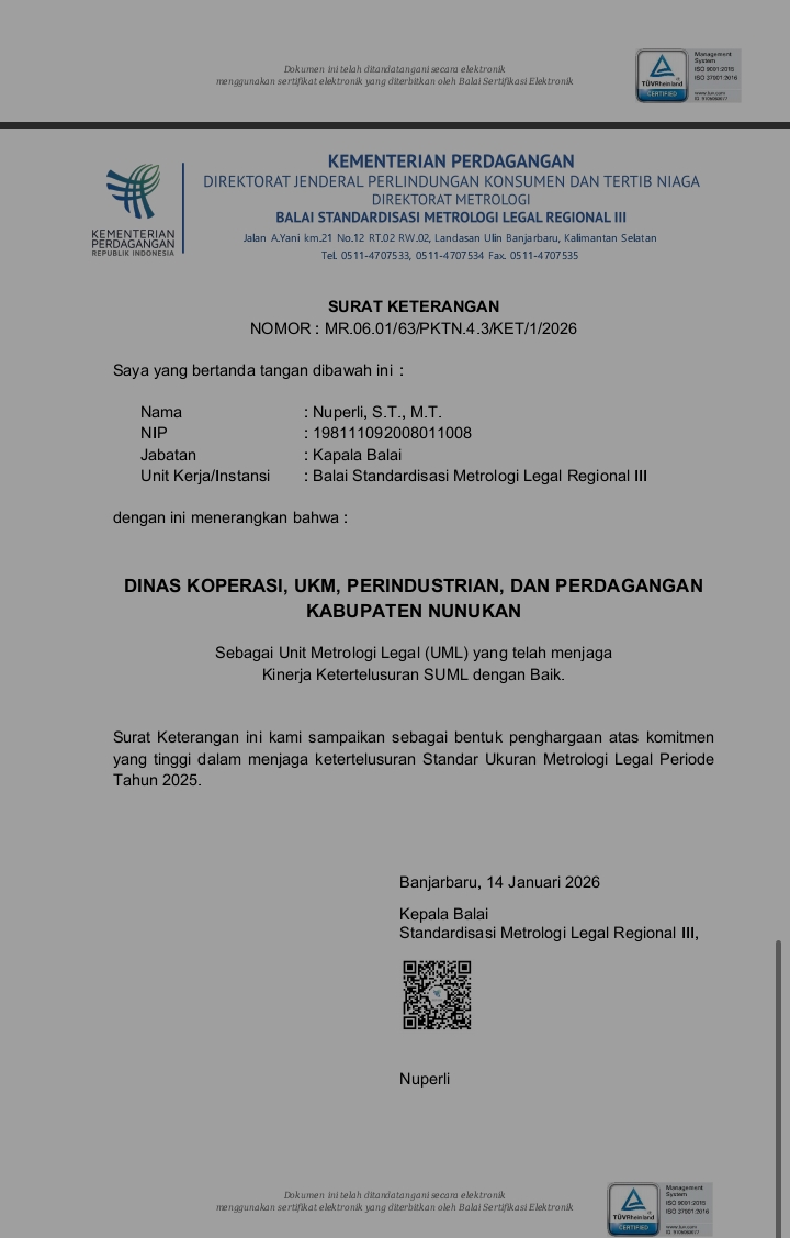 Penghargaan tersebut diberikan kepada DKUKMPP selaku Unit Metrologi Legal (UML) Kabupaten Nunukan setelah dinilai berhasil menjaga kinerja ketertelusuran SUML dengan baik. Penilaian dilakukan oleh Balai Standardisasi Metrologi Legal Regional III Banjarbaru dan hasilnya disampaikan melalui surat tertanggal 14 Januari 2026 Nomor MR.06.01/62/PKTN.4.3/SD/1/2026 tentang Penyampaian Surat Keterangan Penilaian Kinerja Ketertelusuran SUML.
